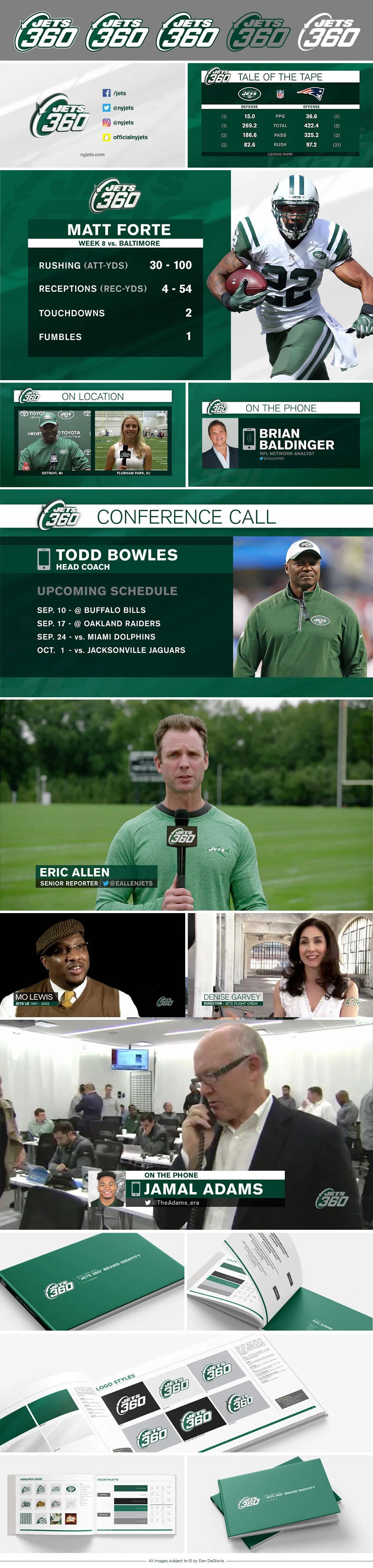 As part of the digital branding of Jets 360 — the in-house production studio and media arm of the NFL’s New York Jets — I led the team responsible for the creation of a cohesive and robust visual identity, including the development of a new logo, title cards, bug, social end card, lower thirds, and toolkit.